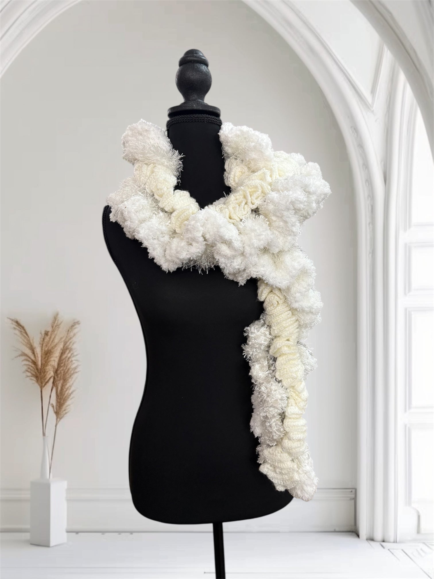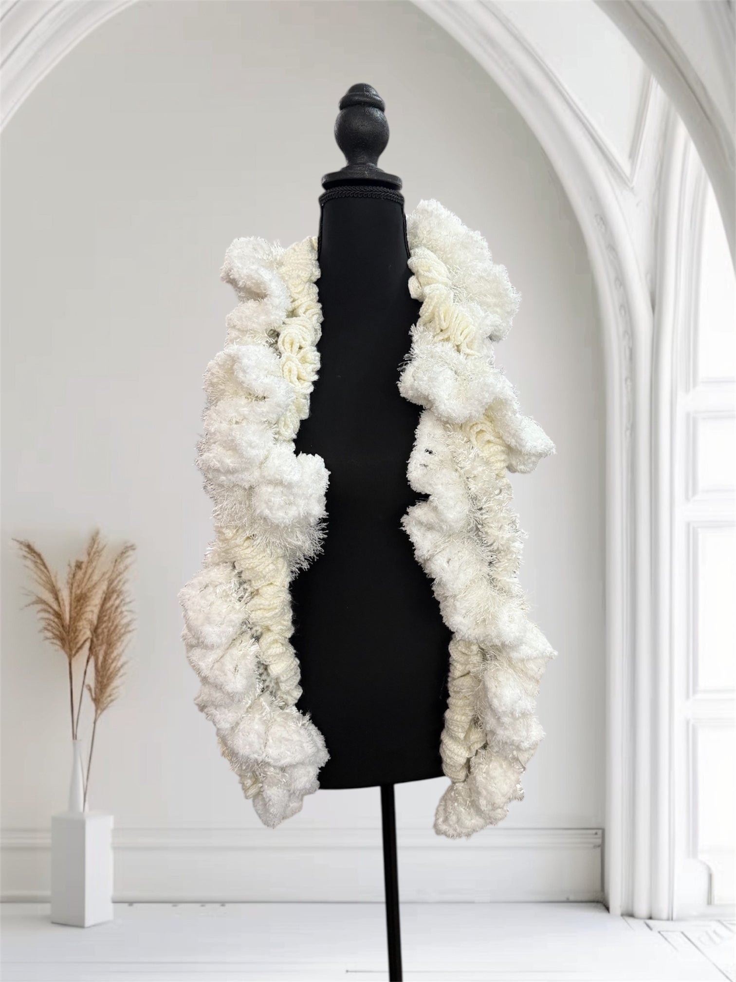 This soft white ivory velvet shawl offers gentle comfort and elegance to keep you cozy.