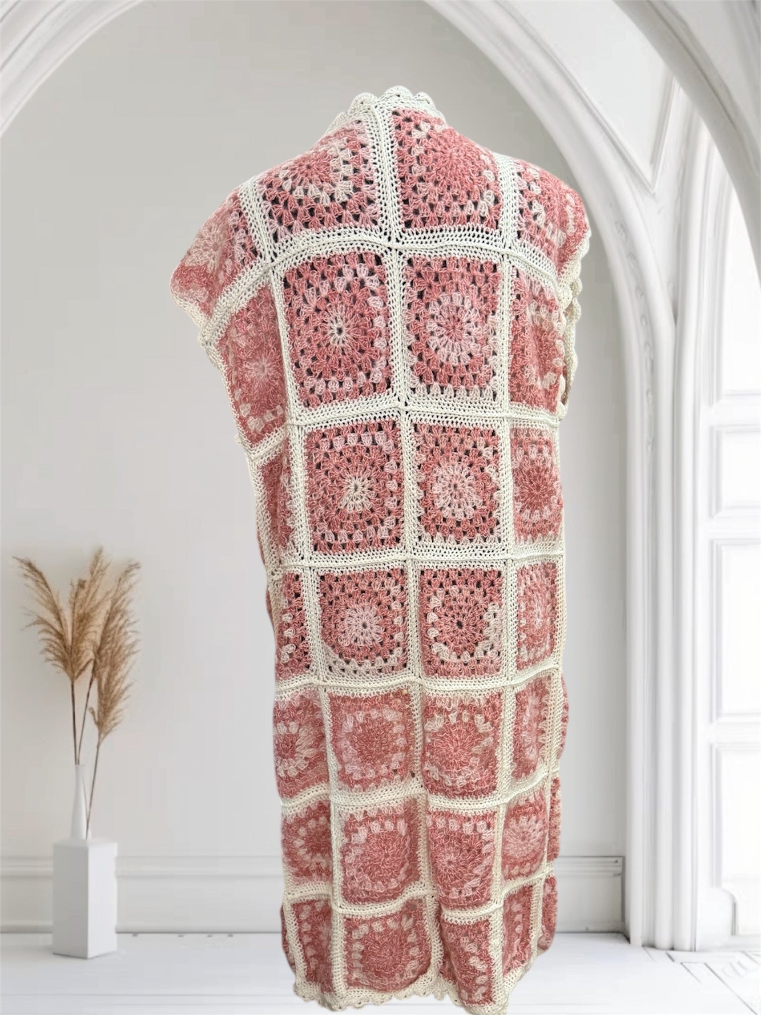 This granny-inspired short-sleeve vest in pink and white is super cozy and oh-so-soft!